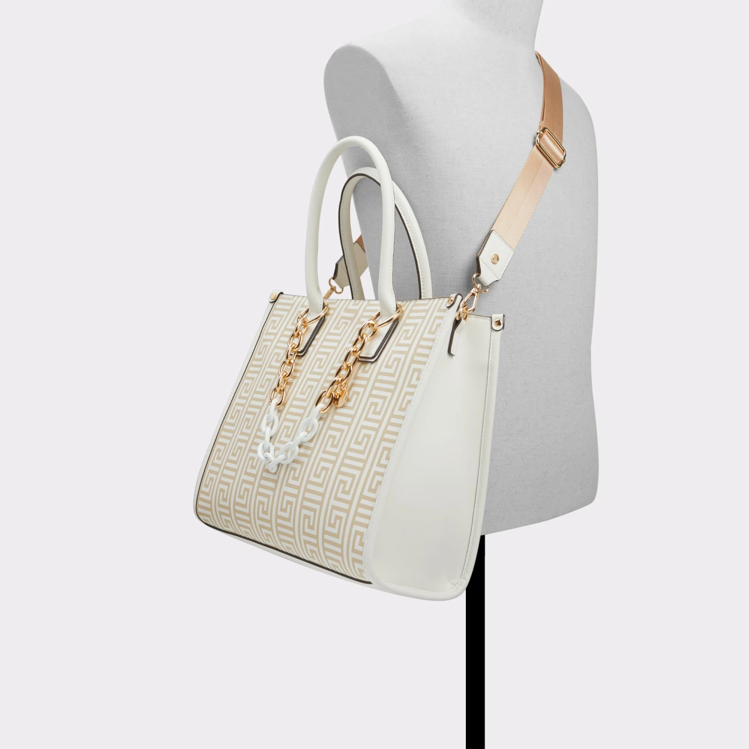 This roomy satchel tote bag features a luxe print and removable chain strap for added style and versatility.